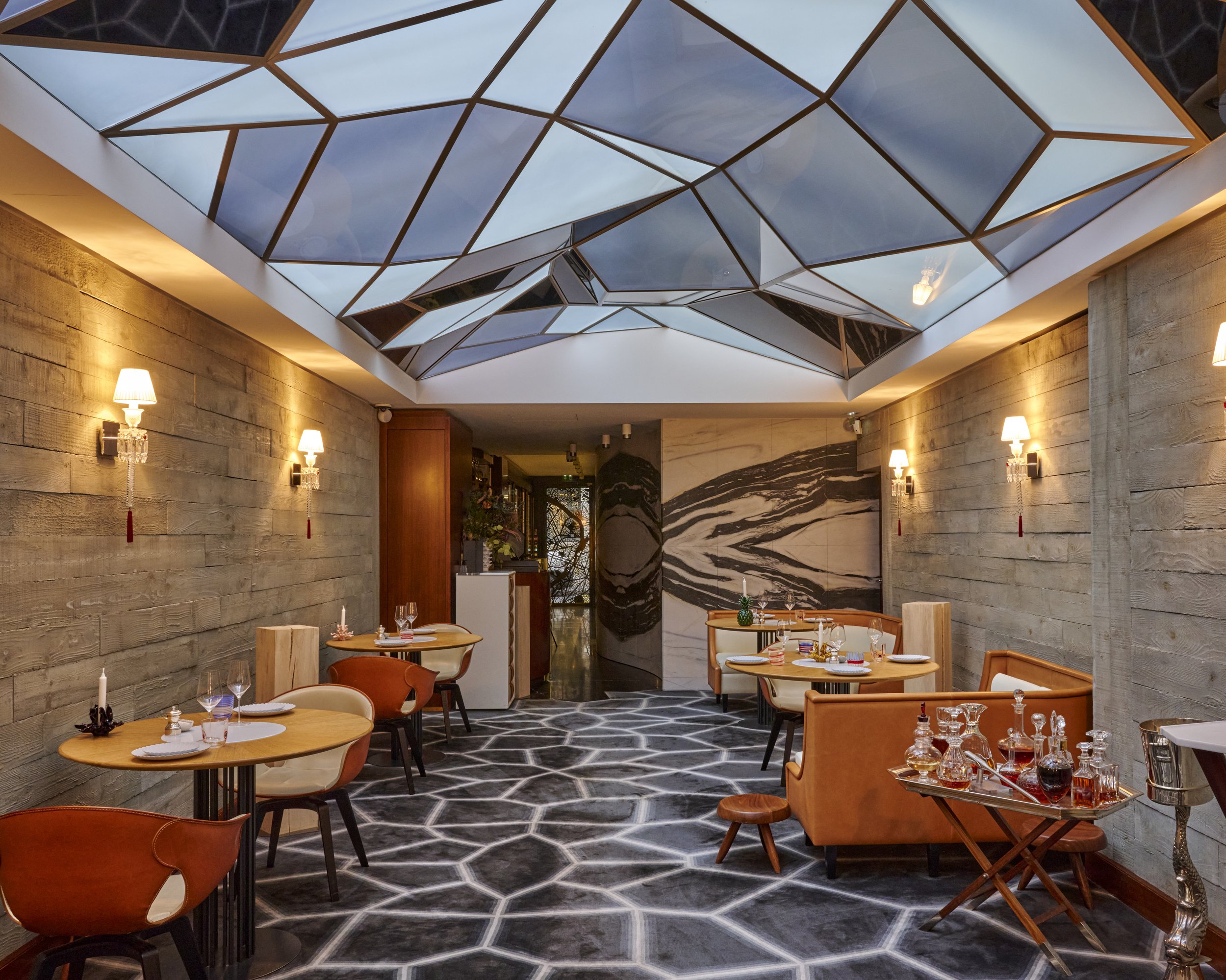 Une émotion qui saisit dès l’entrée avec cette porte de dentelle métallique figurant le plan de Paris, terroir intellectuel et immatériel du Chef. Pénétrant par la cuisine, comme si l’on entrait dans la maison du cuisinier, un écrin contemporain baigné sous une verrière aux lignes géométriques s’offrent aux convives.